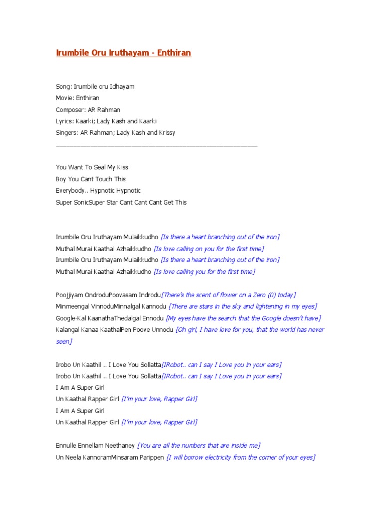Enthiran Songs Lyrics / Rahman, kash n' krissy lyrics: